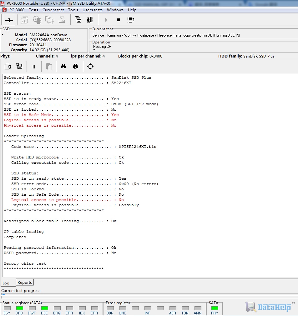 工程师接入PC3000 SSD设备检测硬盘BSY指示灯长亮,无法就绪不能识别硬盘参数